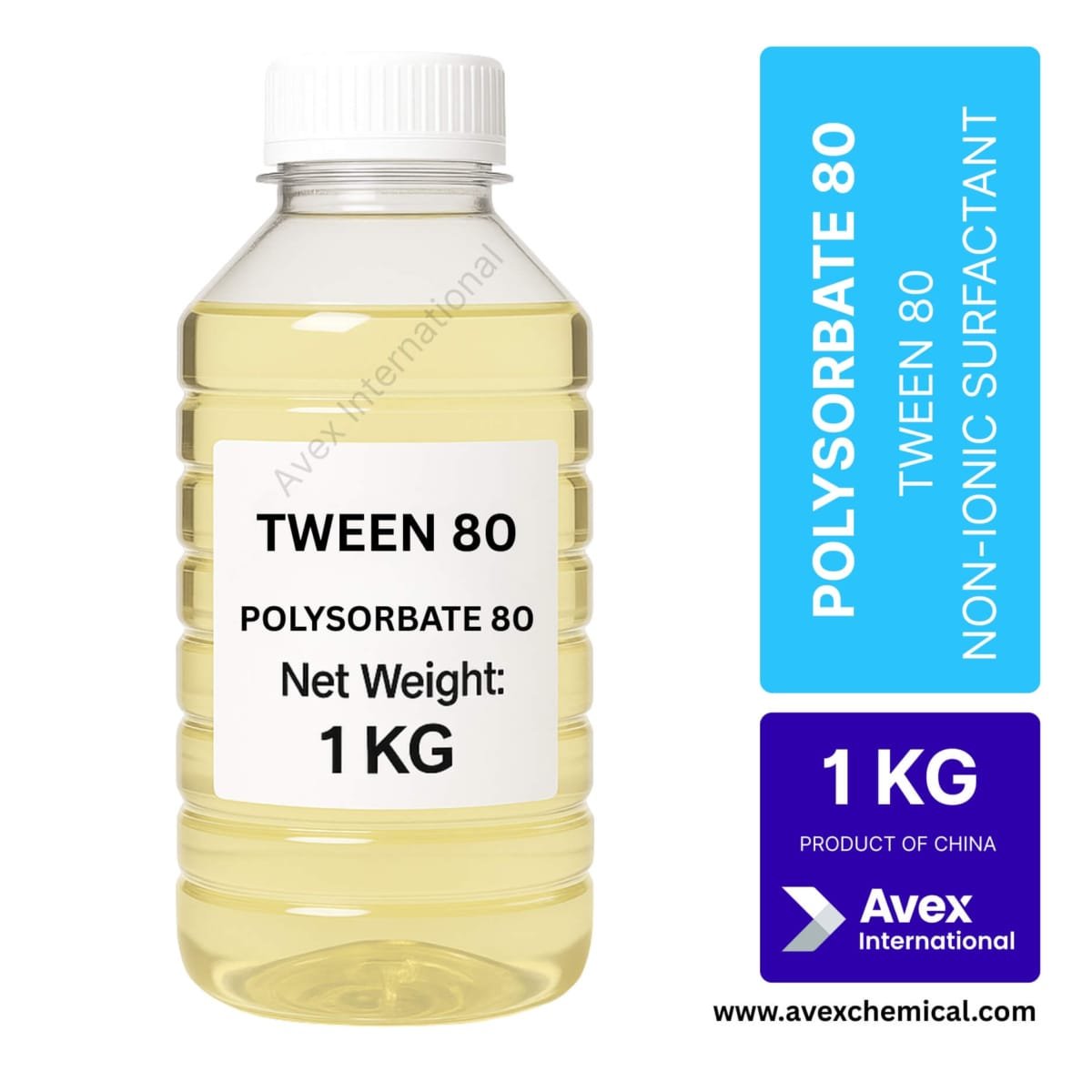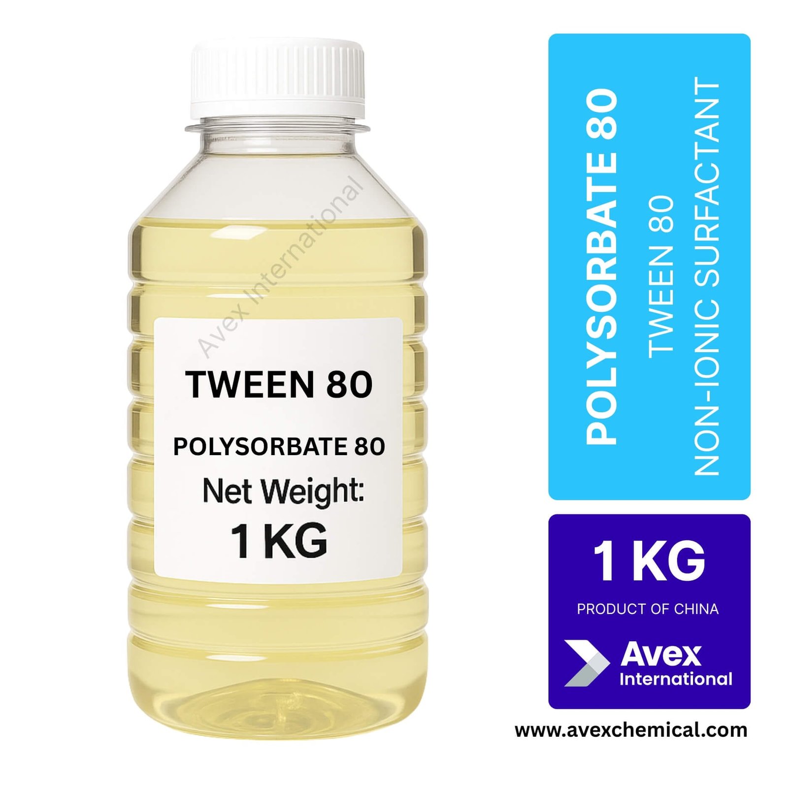 Premium-grade Polysorbate-80 (Tween 80) liquid emulsifier and solubilizer in a sturdy 1KG/ 5KG/25KG jerrycan. Ideal for cosmetics, food & beverage, pharmaceuticals, and industrial formulations.
